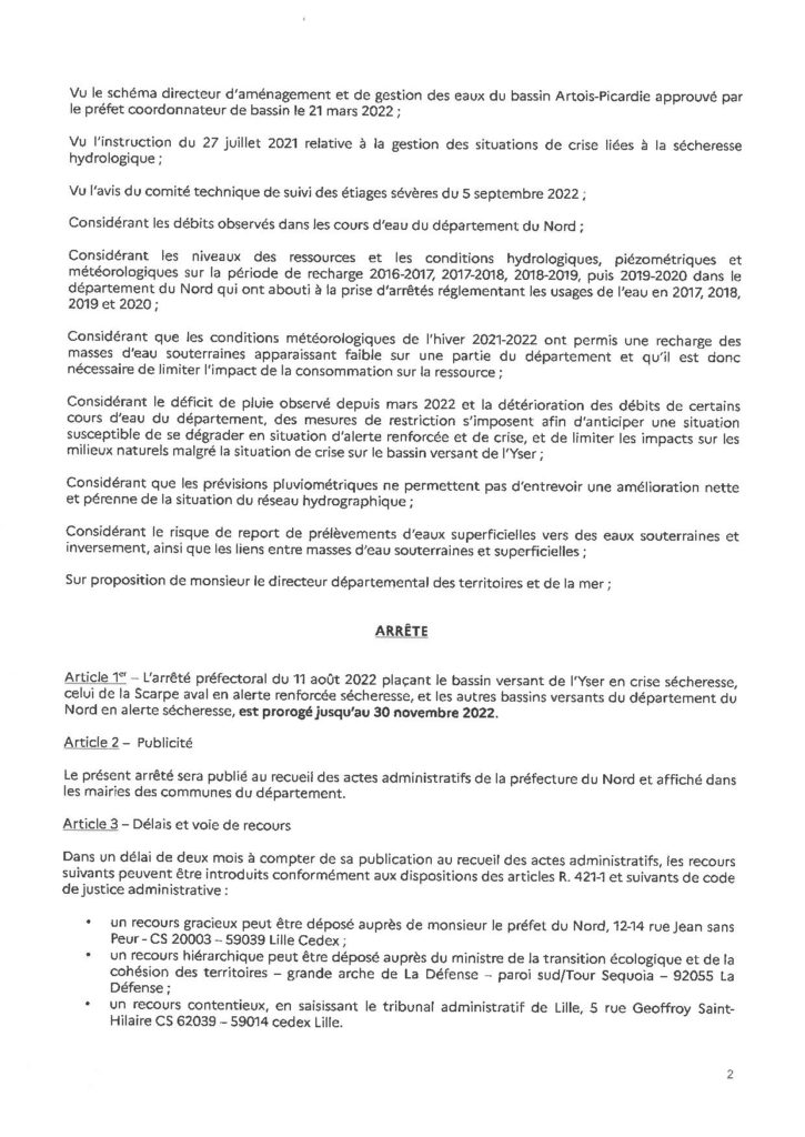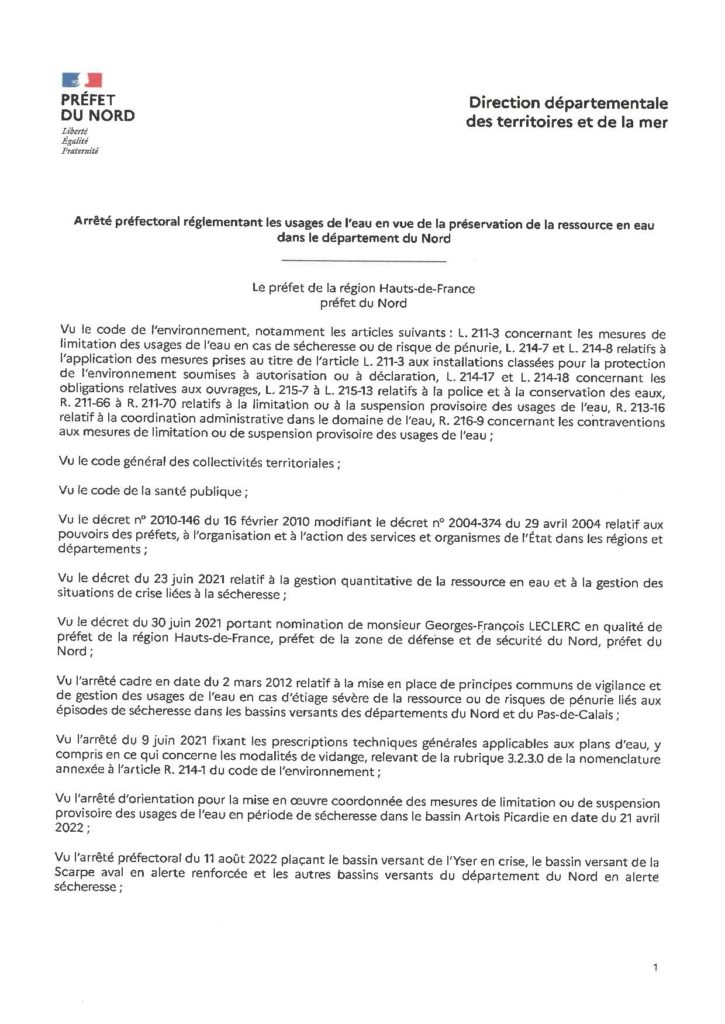 Prorogation de l’arrêté préfectoral réglementant les usages de l’eau jusqu’au 30 novembre 2022.