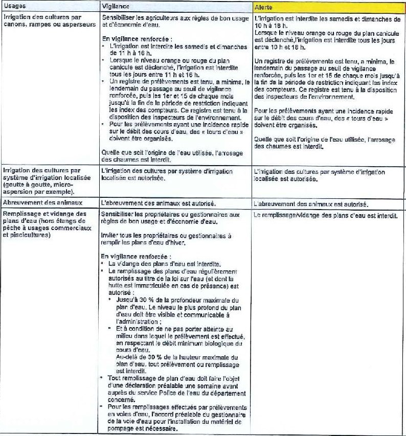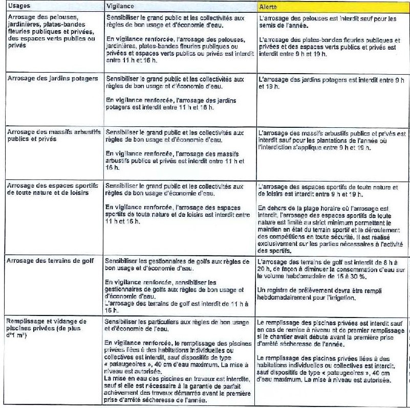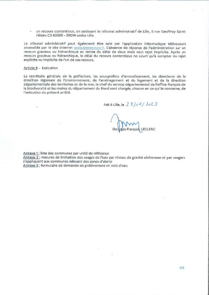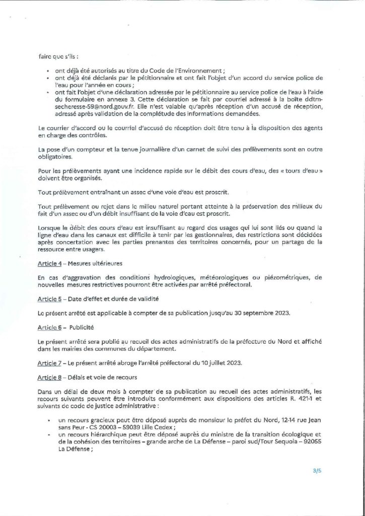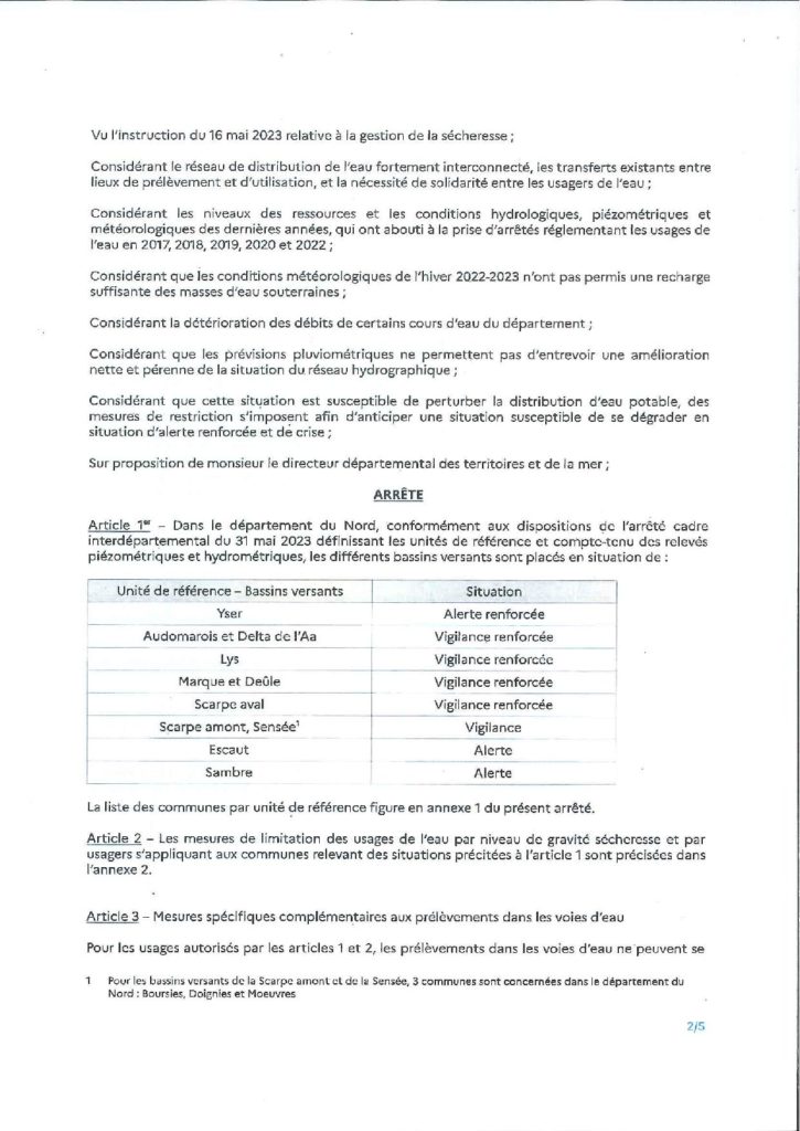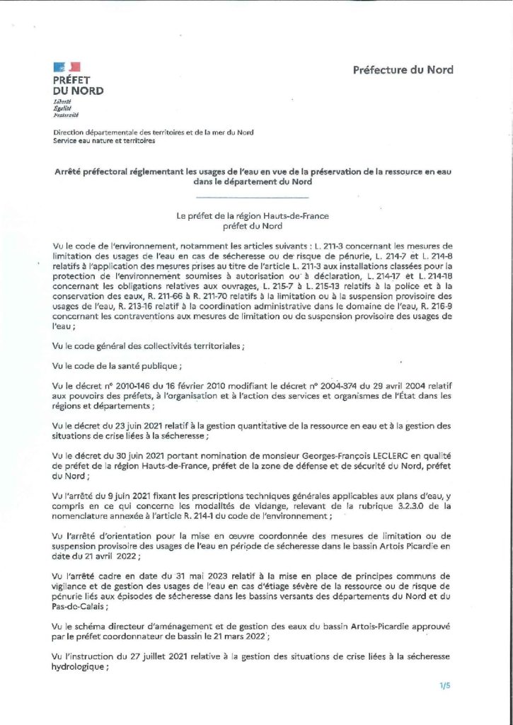 Arrêté préfectoral réglementant les usages de l’eau en vue de la préservation de la ressource en eau dans le département du Nord