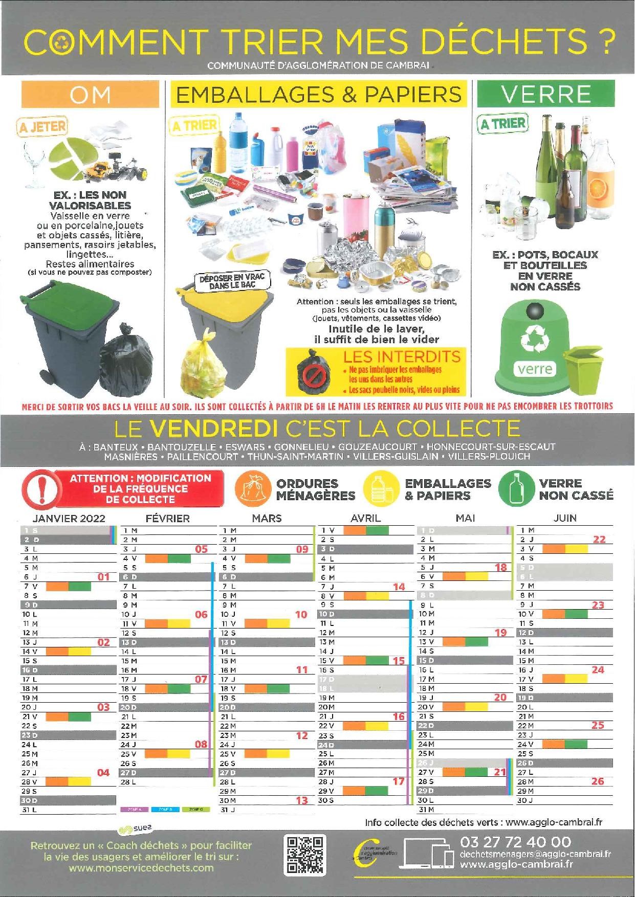 • INFORMATIONS SUR LES COLLECTES DES DECHETS MENAGERS A PARTIR DU 01/01/22 – MIS EN PLACE PAR LA COMMUNAUTE D’AGGLOMERATION DE CAMBRAI