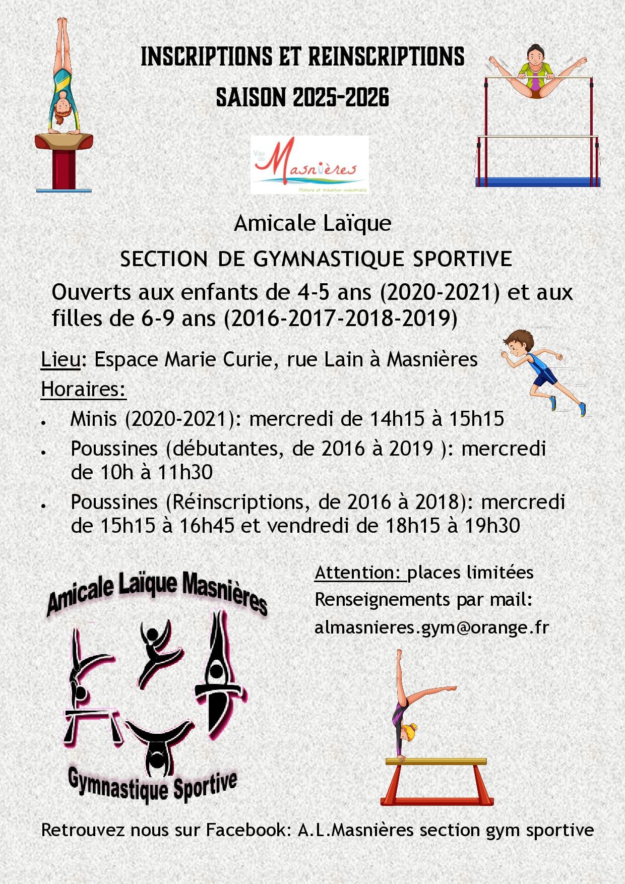 L’Amicale Laïque ouvre une section Gymnastique Sportive, pour les enfants de 4-5 ans (2020-2021) et les filles de 6-9 ans (2016-2019).
