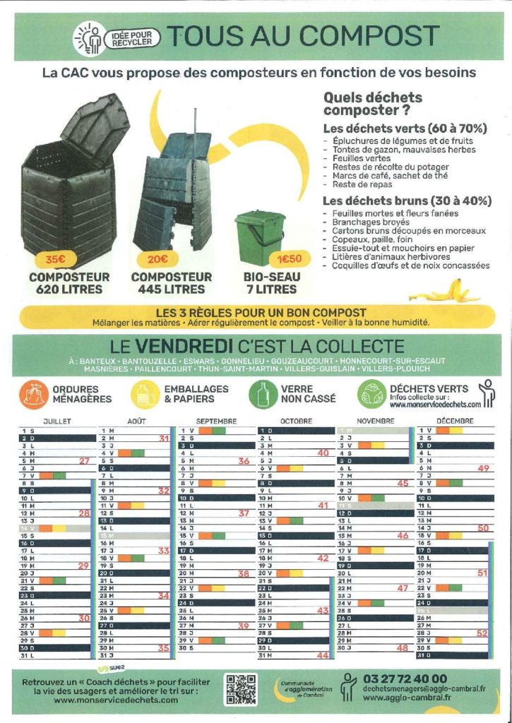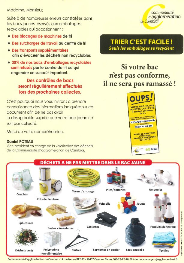 Suez recyclables et revalorisations gère la collecte sélective et la collecte des déchets ménagers le vendredi sur Masnières ainsi que la réparation des poubelles détériorées: