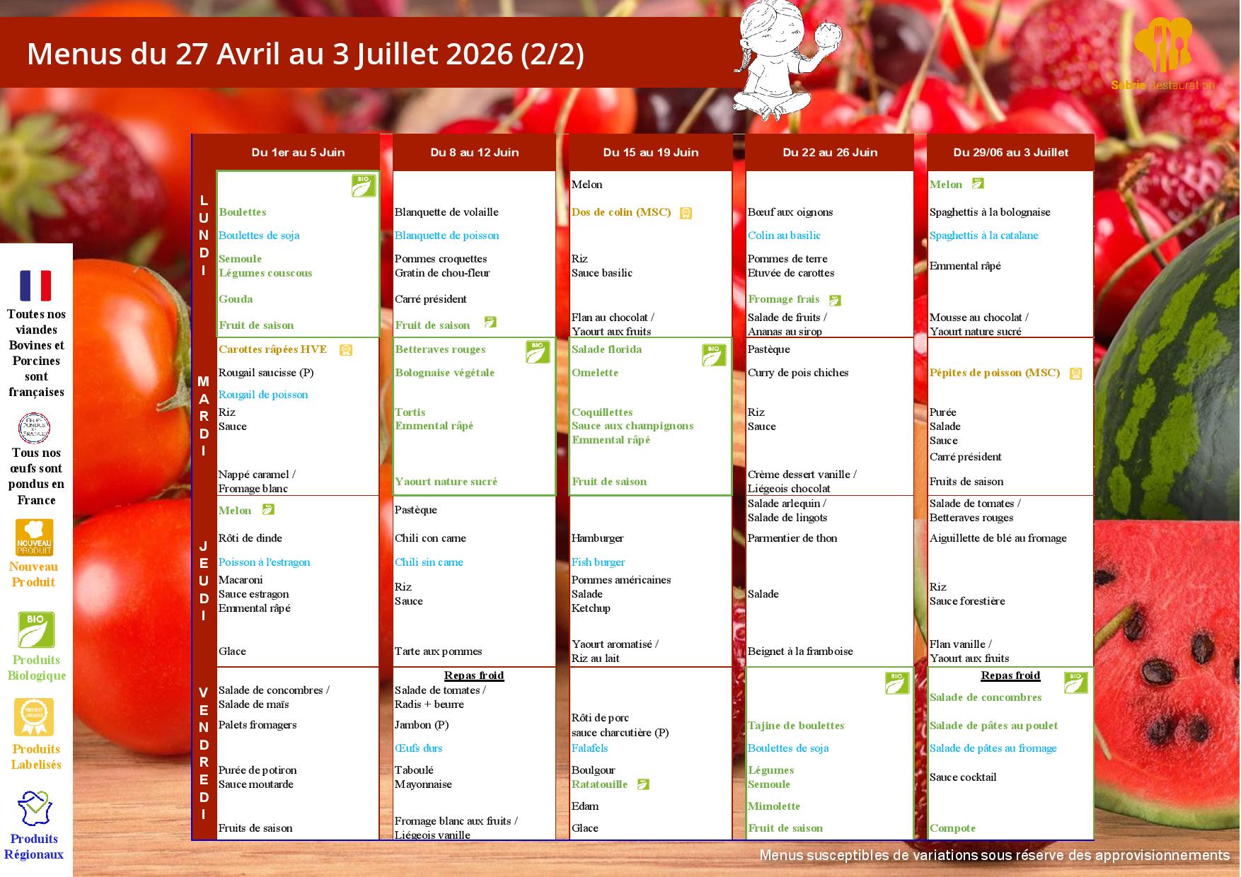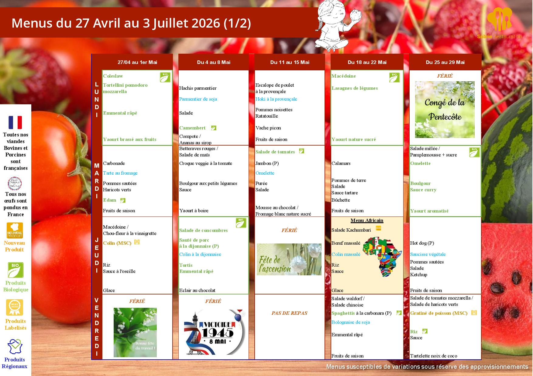Pour chaque repas commandé, celui-ci sera facturé s’il n’est pas décommandé au plus tard la veille avant 10h (en cas d’absence pour maladie, absence de professeur, classe fermée etc…)