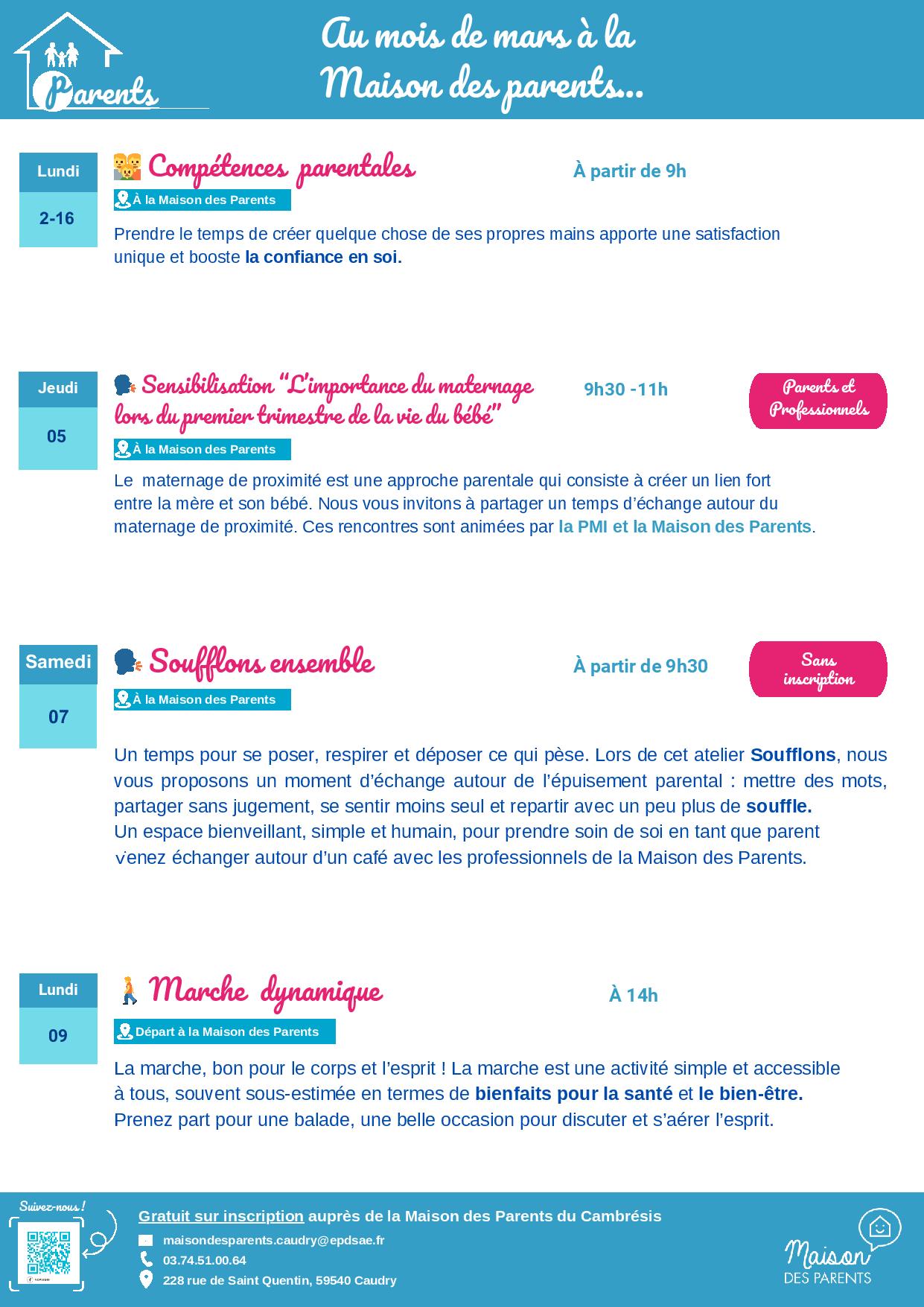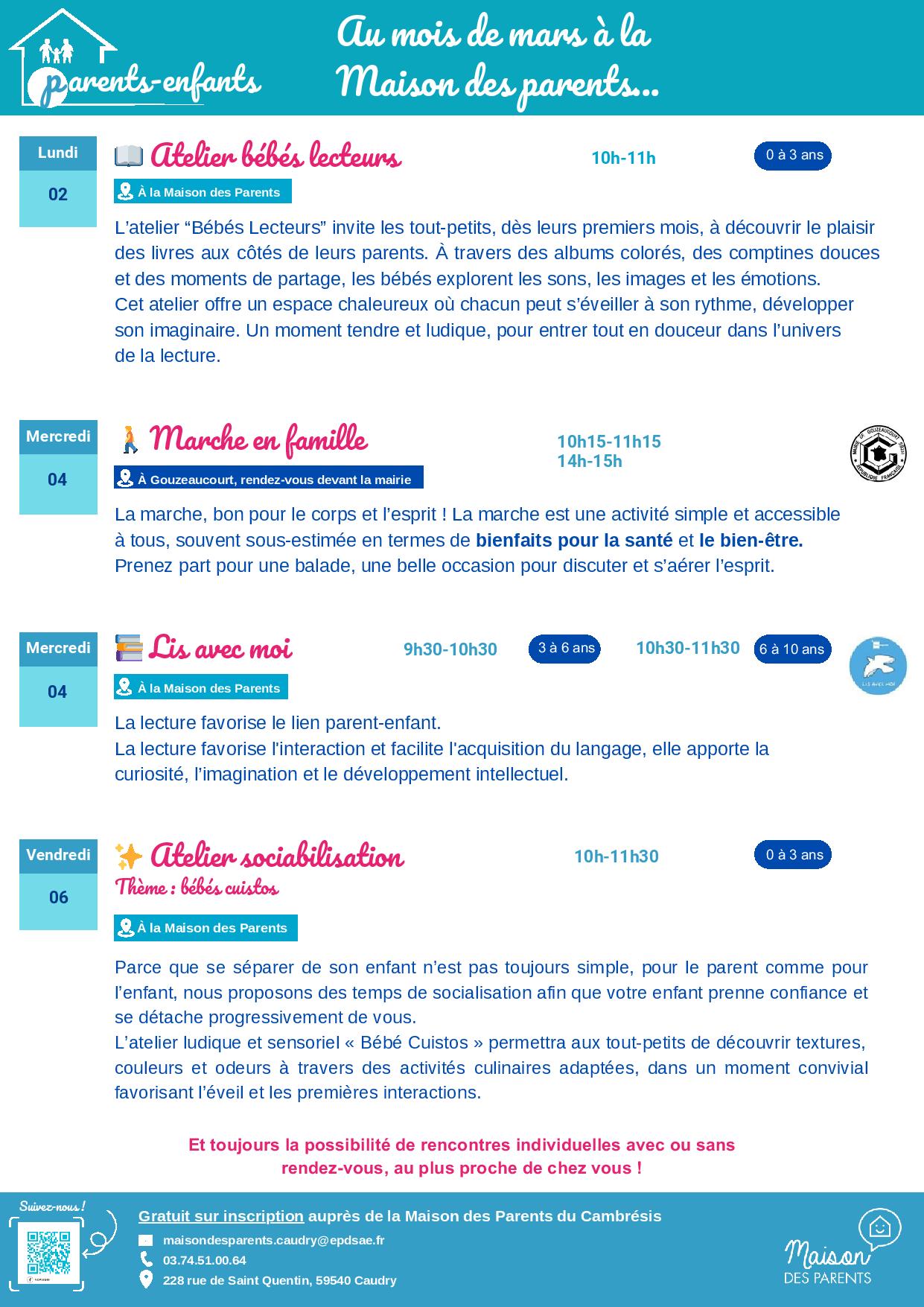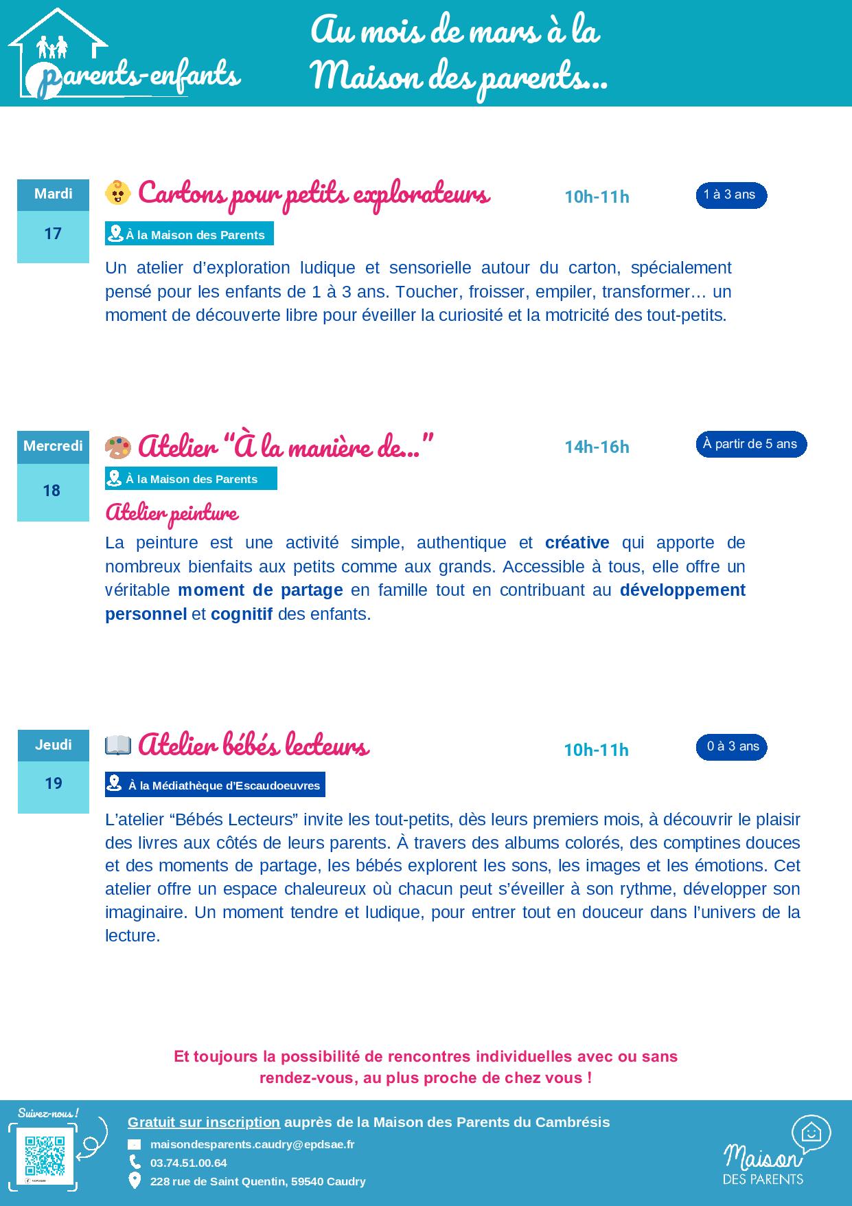 -Des ateliers Parents: pour prendre du temps pour vous, échanger avec d’autres parents autour d’une activité manuelle, d’un atelier cuisine, de séance bien-être…